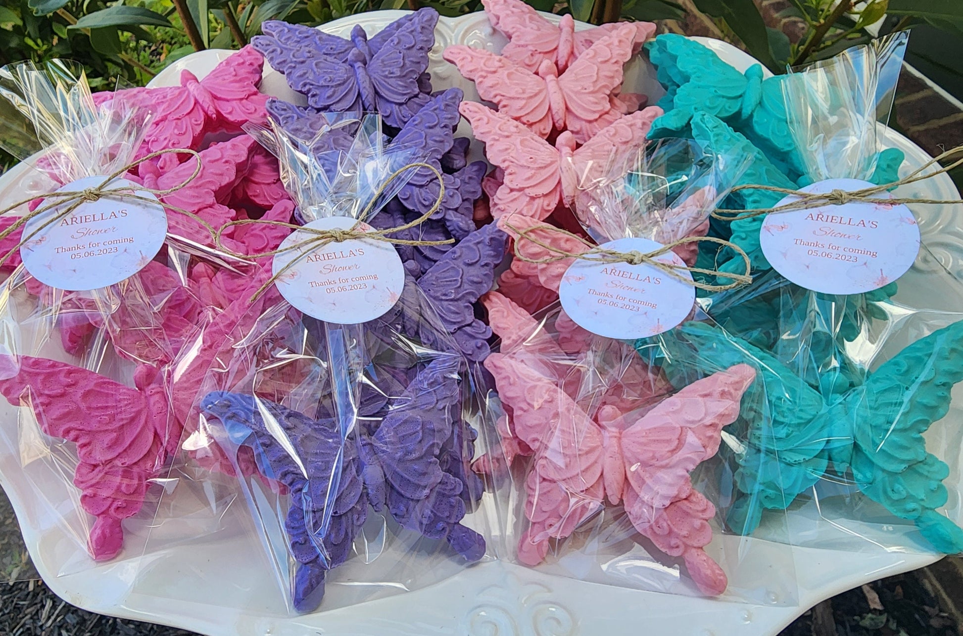 Each soap is custom made by me in small batches so you can choose the scent and the color of your soap. Each butterfly soap comes in cellophane bag tied with twine and a personalized tag.