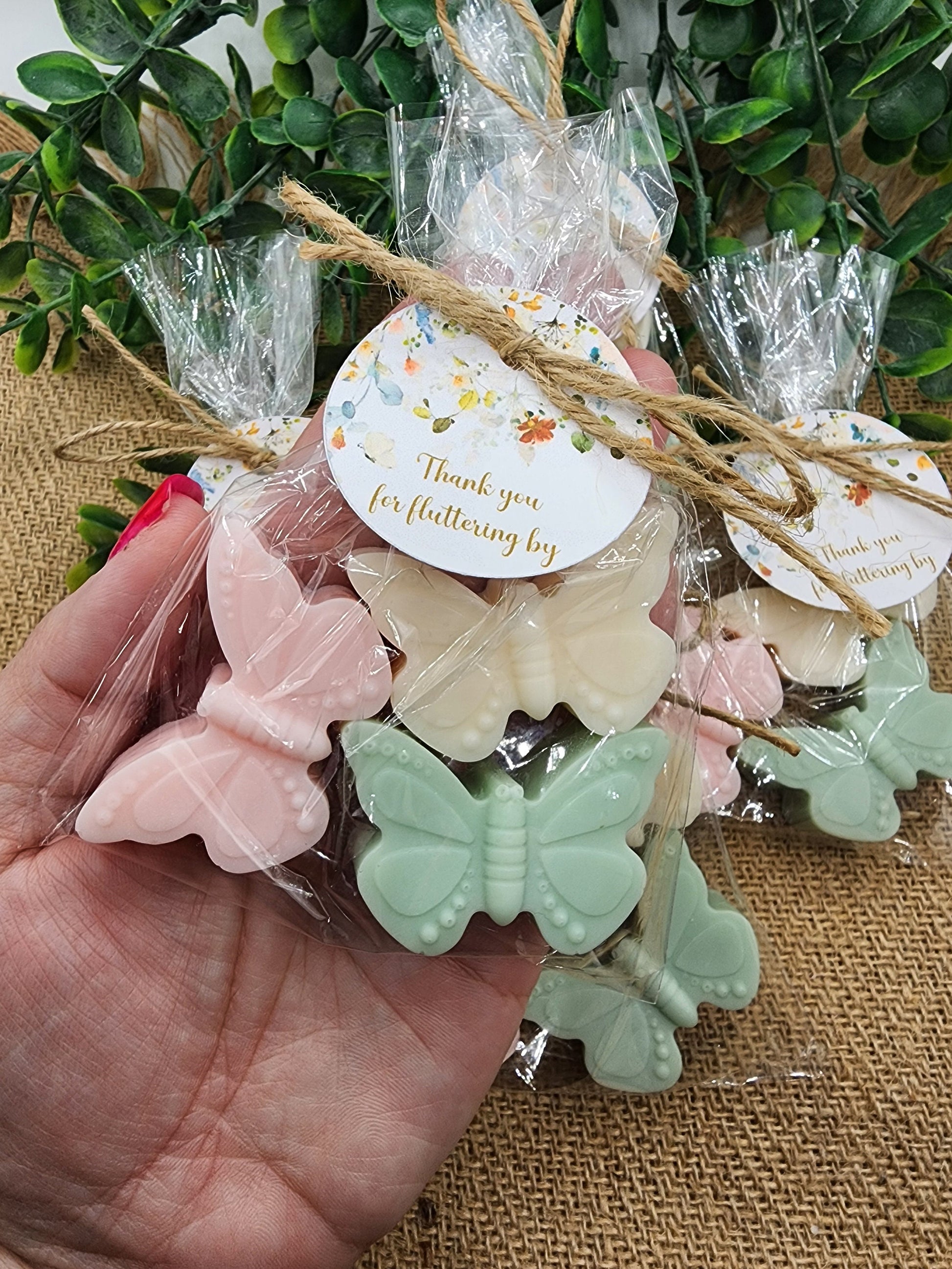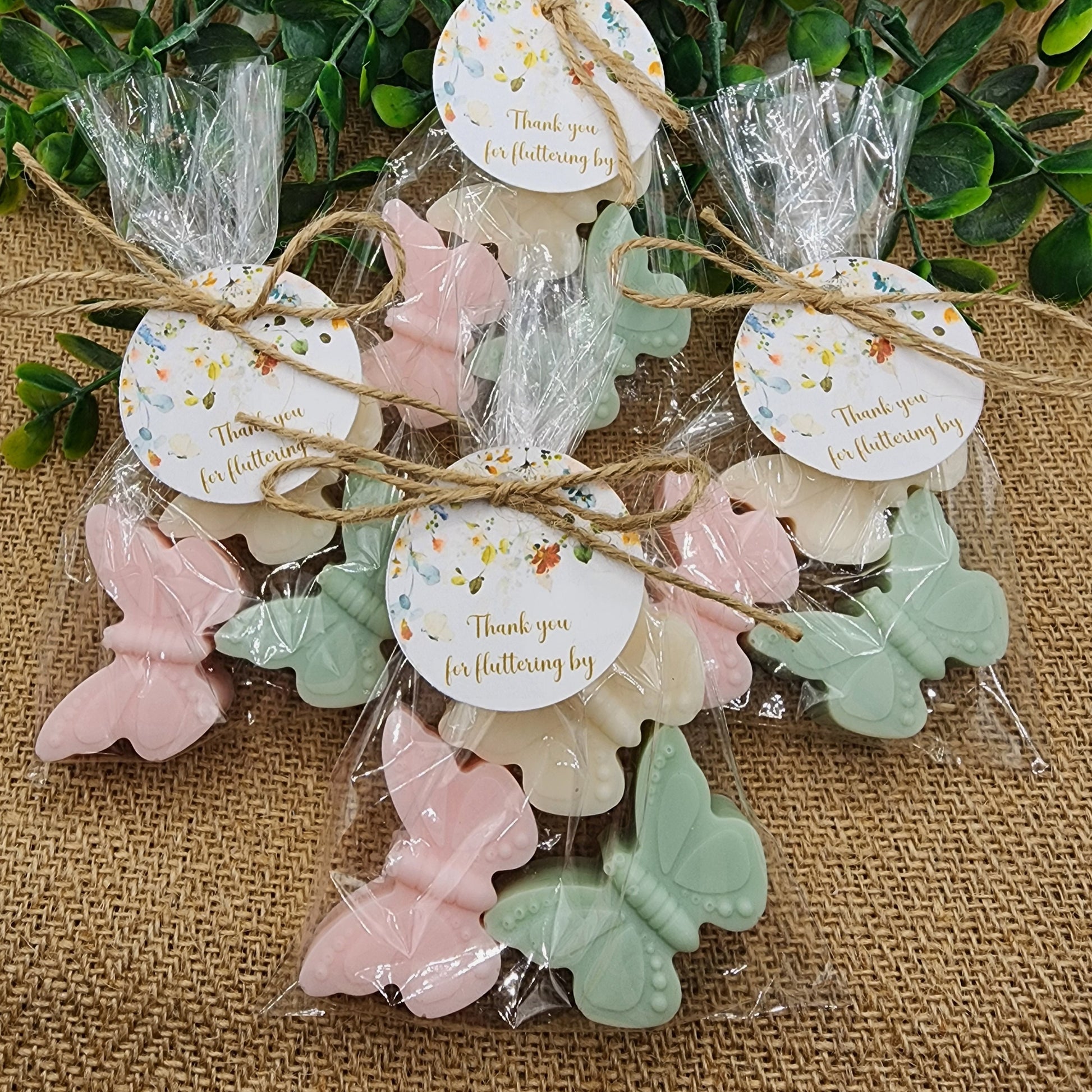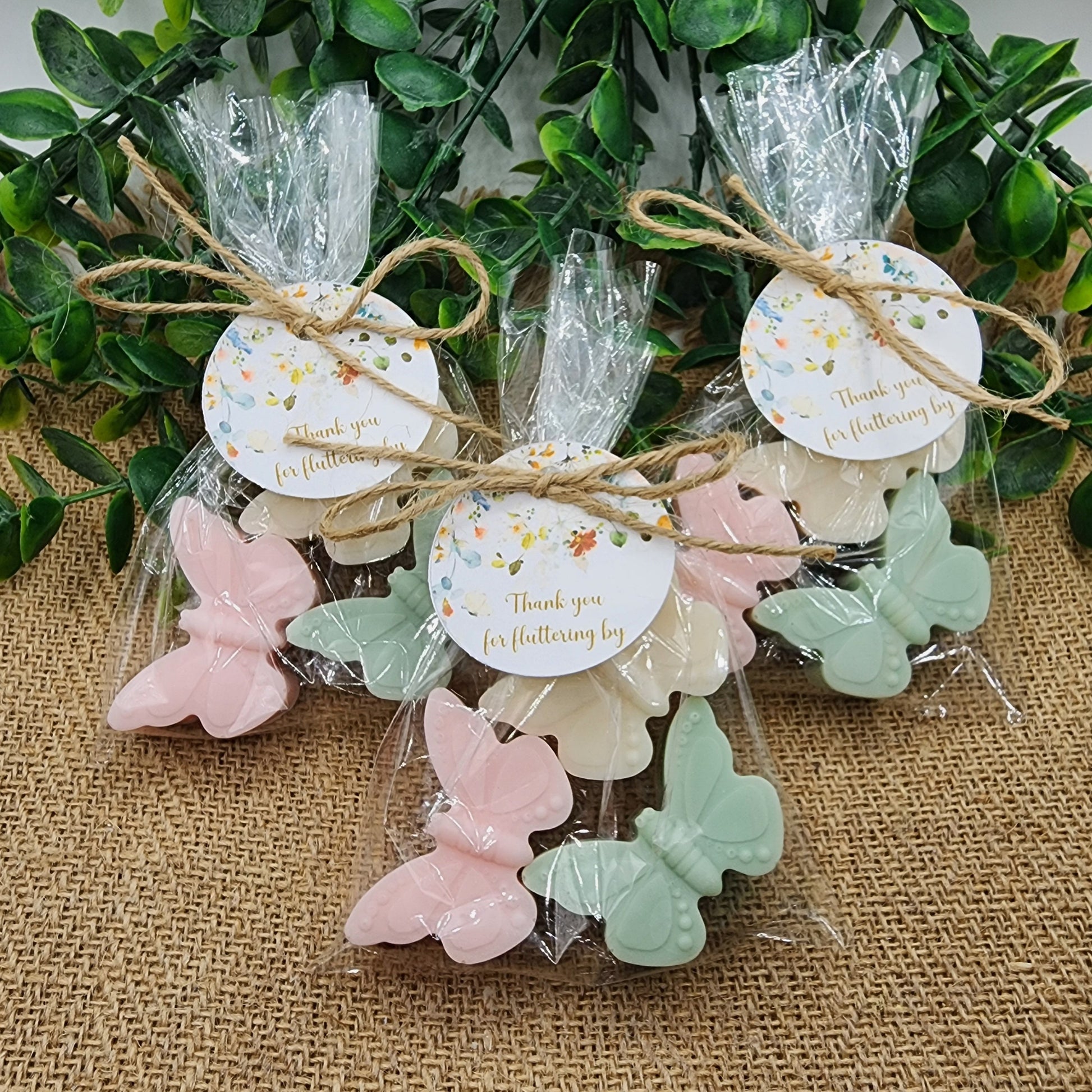 Each soap favor comes with 3 butterflies in a cellophane bag tied with twine and a personalized tag in the colors and scent you choose.