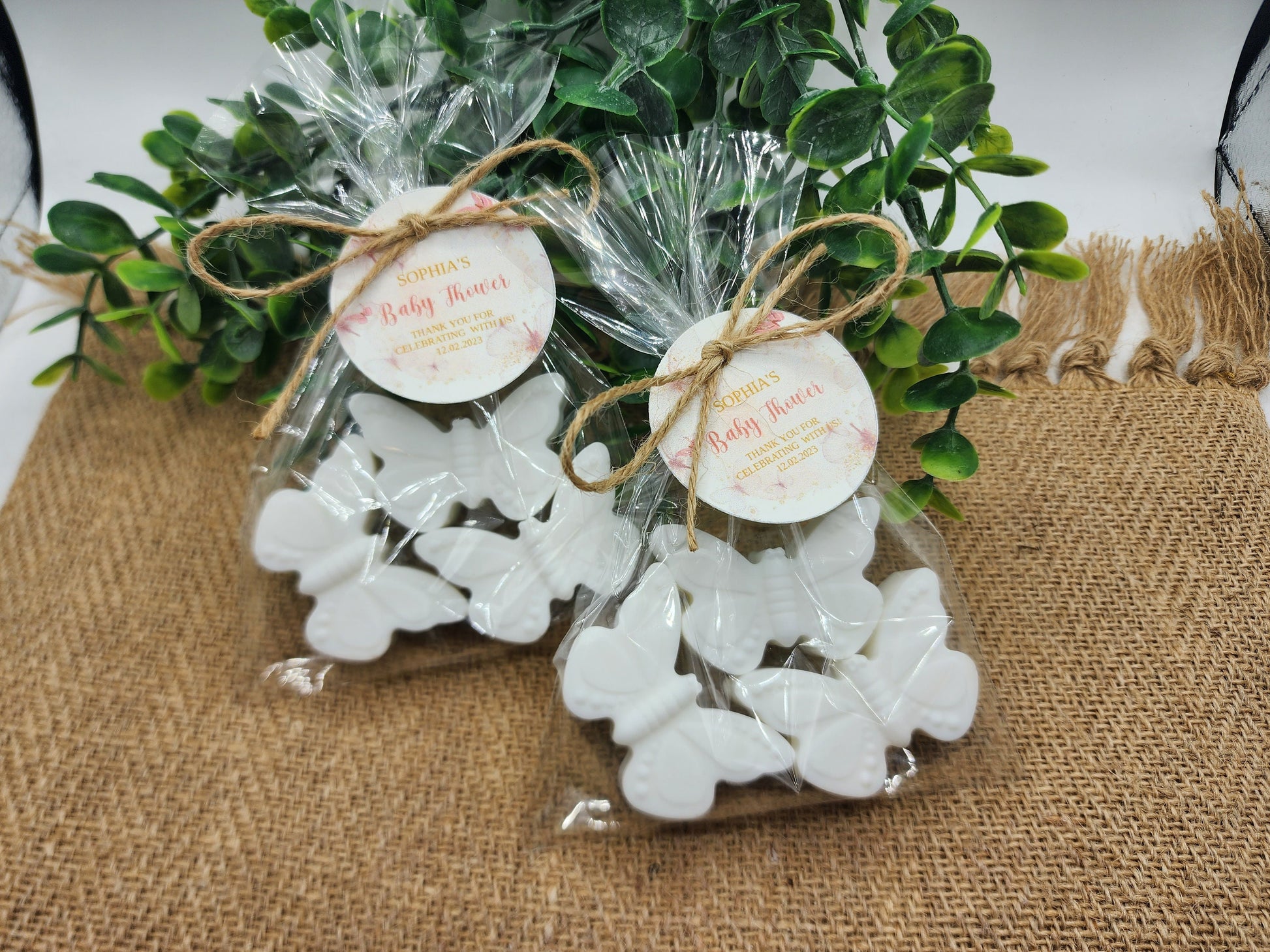 Each soap favor comes with 3 butterflies in a cellophane bag tied with twine and a personalized tag in the colors and scent you choose.