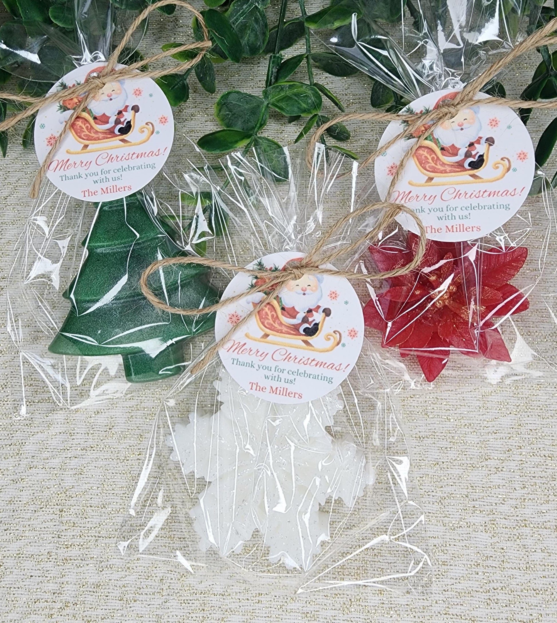Each soap is individually wrapped and adorned with a holiday-themed tag, offering a delightful, aromatic touch to your celebrations. These charming favors make thoughtful gifts, adding warmth and cheer to every guest’s experience.