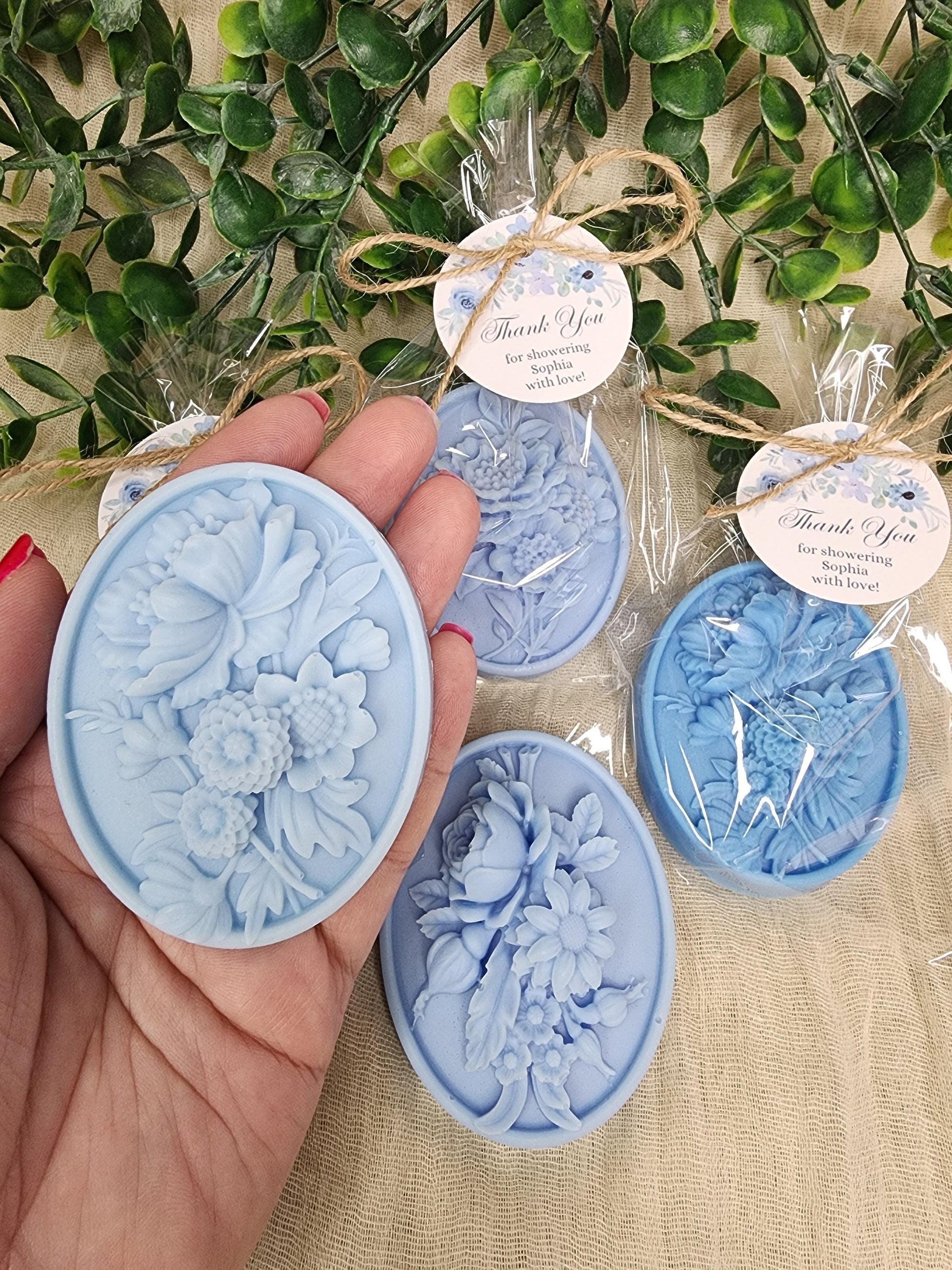 Celebrate with our dusty blue flower soap favors.