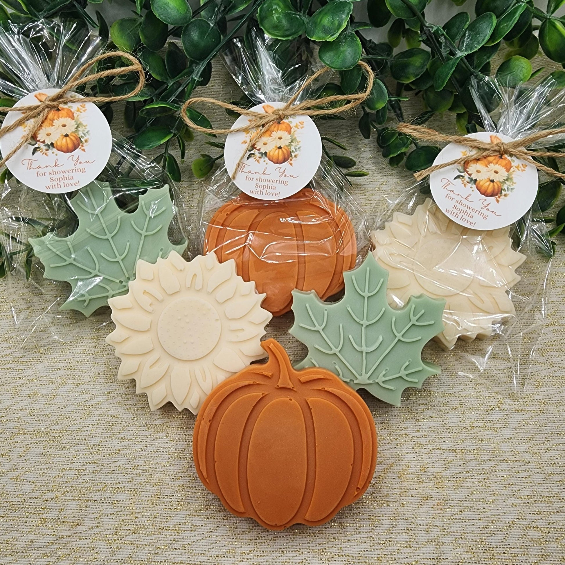 These charming creations, individually wrapped in elegant cellophane bags and accompanied by a personalized tag will make the perfect addition to baby showers, bridal showers, and fall-themed weddings. Each fall soap weights approximately 1.5 oz.