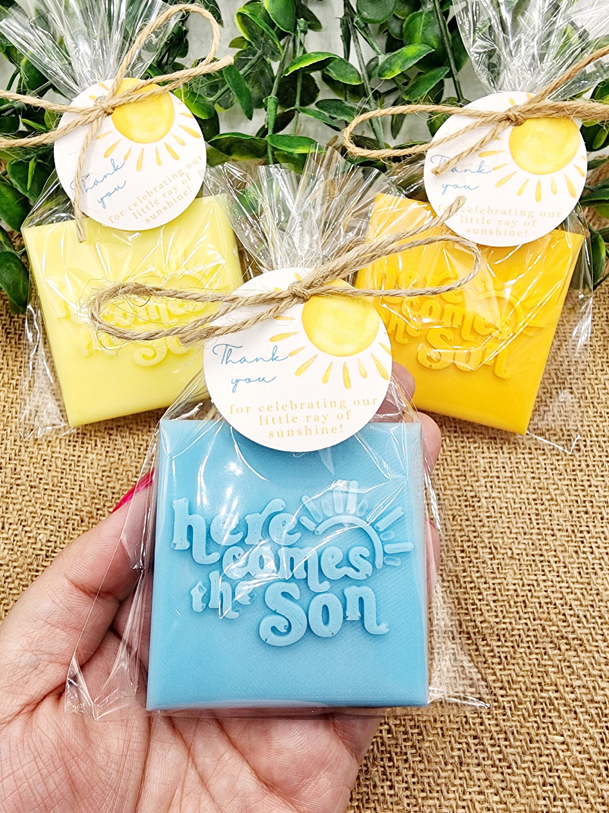 These here comes the son baby shower soap favors are the perfect touch of sunshine for your special celebration. each soap bar is 2.5 x 2.5 inches and weights approximately 1.7 oz. Each soap is delicately crafted and individually wrapped in a cellophane bag tied with twine, making it a convenient and mess-free gift for your guests. The personalized tag adds a unique touch, allowing you to customize the favors to match your theme or include a heartfelt message. With a wide range of scents and colors to choose from, you can create a truly personalized and memorable experience for your loved ones. Let the warm, comforting glow of these baby shower favors add an extra touch of joy to your special day. Please don't hesitate to contact me if you have any questions or special requests!