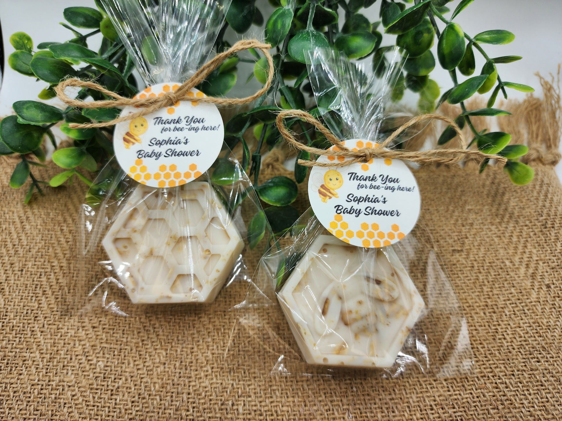Indulge in the sweetness of our honeycomb soap favors with a touch of oatmeal, perfect for celebrating baby showers, bridal showers, and wedding showers. Each soap weights a little over 1 oz which makes this bar of soap the perfect size for your guests. Each soap is meticulously handcrafted to resemble delicate honeycomb patterns, capturing the essence of nature's beauty. The addition of oatmeal provides a gentle exfoliation, leaving your skin feeling soft and refreshed. You can choose one of the many scents listed in the pictures and I can also make them any colors you would like. Each favor comes lovingly wrapped and adorned with a personalized tag, making them a thoughtful and elegant token of appreciation for your guests. Share the gift of relaxation and luxury with these charming honeycomb soap favors, a reminder of the sweet moments shared during your special celebration. Please don't hesitate to ask any questions you might have! Thank you ❤️