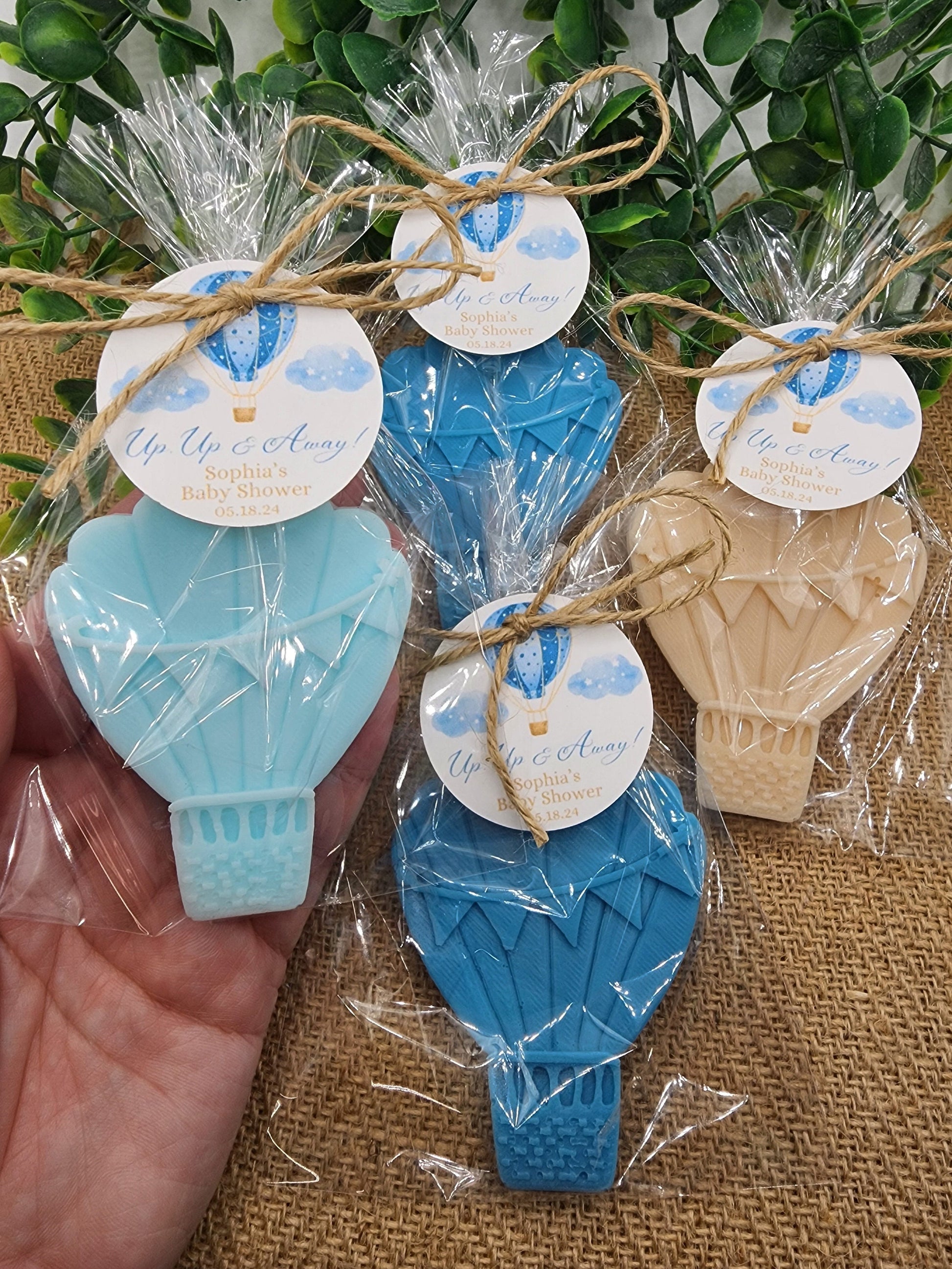 Each soap is beautifully crafted in the shape of a whimsical hot air balloon, individually wrapped, and adorned with a personalized tag.