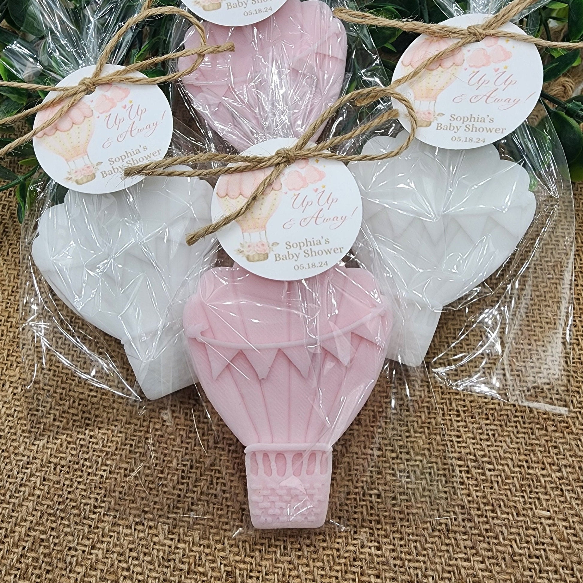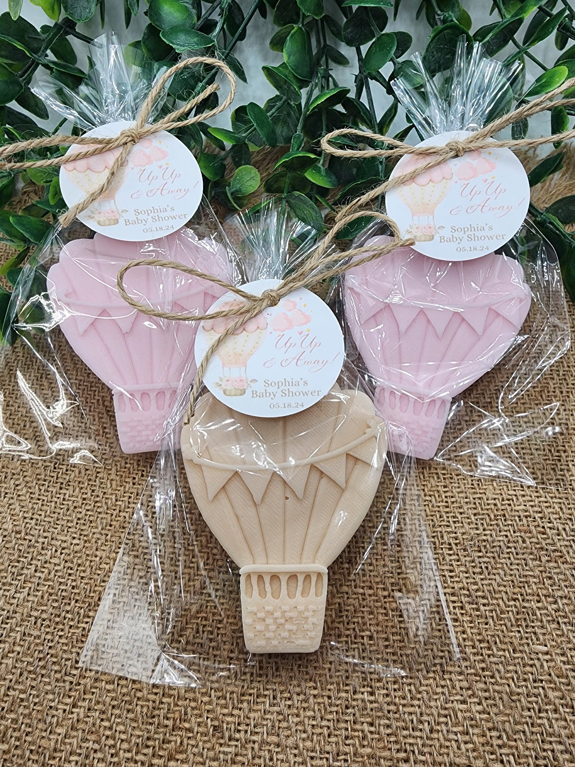 Each soap is beautifully crafted in the shape of a whimsical hot air balloon, individually wrapped, and adorned with a personalized tag.