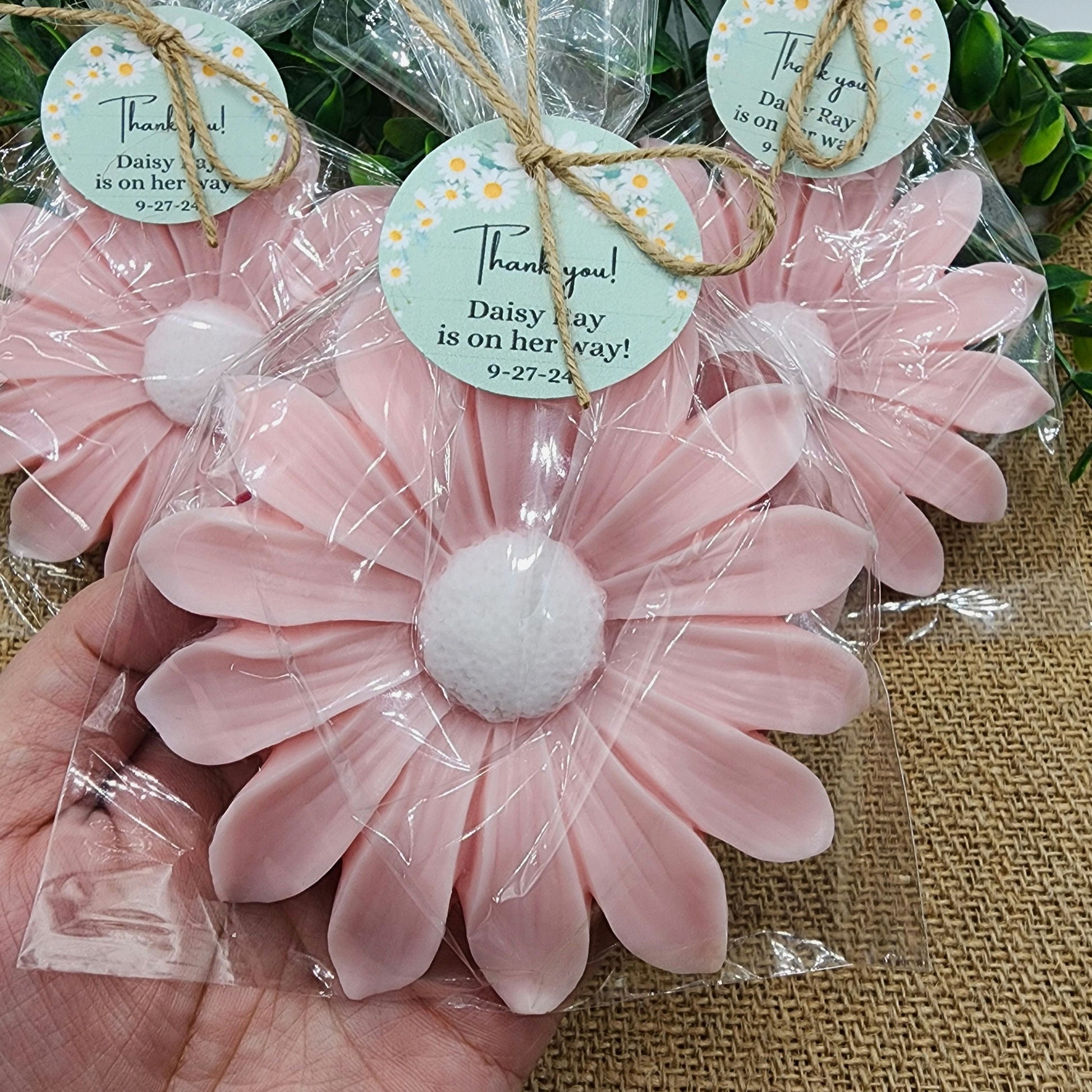 Each soap is delicately crafted to resemble a daisy, individually wrapped and complete with a personalized tag, making them a charming addition to any event.