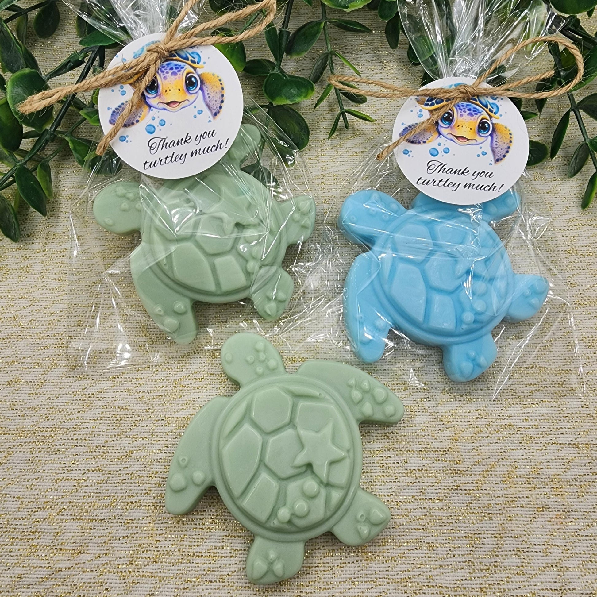 Dive into the magic of the sea with our sea turtle soap favors, perfect for baby showers and bridal showers. Each soap is meticulously shaped like a charming sea turtle, individually wrapped, and comes with a personalized tag. Available in any color and scent(scents are listed in one of the pictures), these delightful favors bring a touch of oceanic whimsy to your celebration. Each sea turtle is approximately 3 inches and weights approximately 1.3 oz. Treat your guests to a unique and fragrant gift that captures the beauty and grace of these majestic creatures. Feel free to ask any questions that you might have! Thank you so much for supporting my small business ❤️