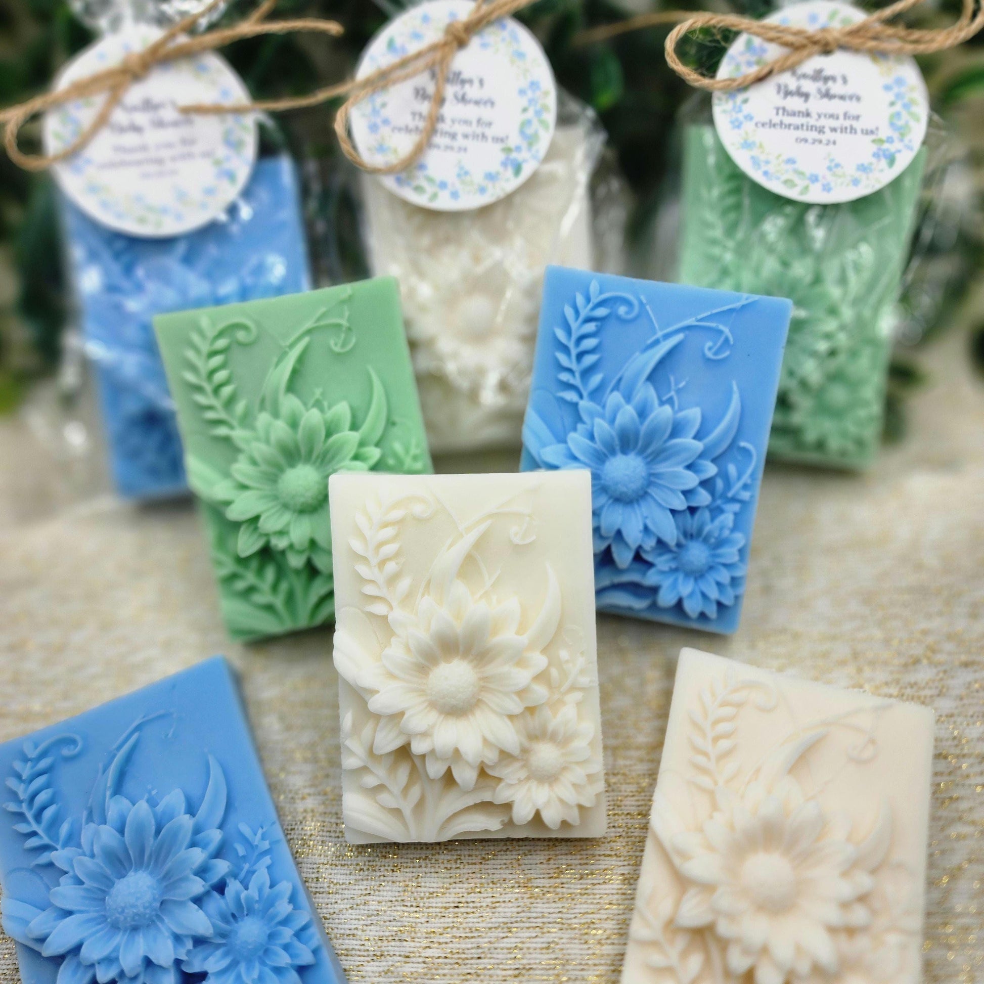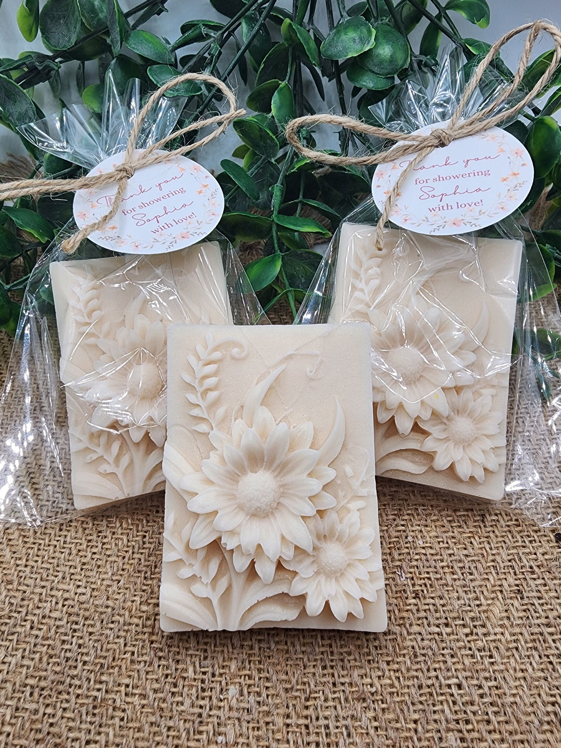 Our wildflower soap favors are the perfect addition to any baby shower or bridal shower. Each soap is individually wrapped in a cellophane bag and tied with twine, making them a beautiful and elegant gift for your guests. The soaps are delicately scented with the fragrance that you choose, creating a refreshing and relaxing sensory experience. The intricate rose designs are carefully crafted and colored, bringing a touch of whimsy and beauty to these handmade favors. These soap favors not only serve as a thoughtful gesture to show your appreciation to your guests, but they also double as a practical gift that can be used and enjoyed long after the event. Please don't hesitate to contact me if you have any special requests. Thank you!