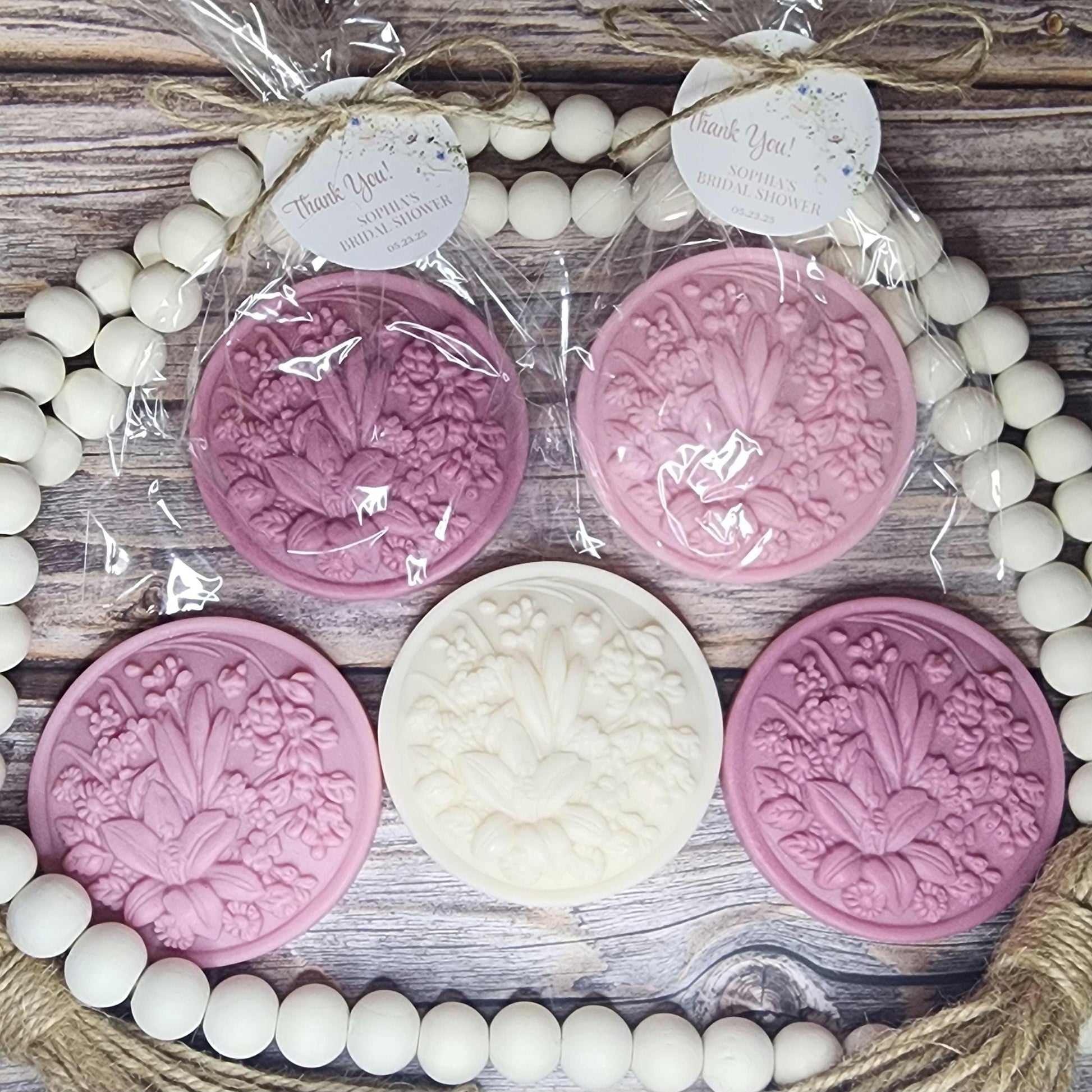 The soaps are delicately scented with the fragrance that you choose, creating a refreshing and relaxing sensory experience. The intricate floral designs are carefully crafted and colored, bringing a touch of whimsy and beauty to these handmade favors.